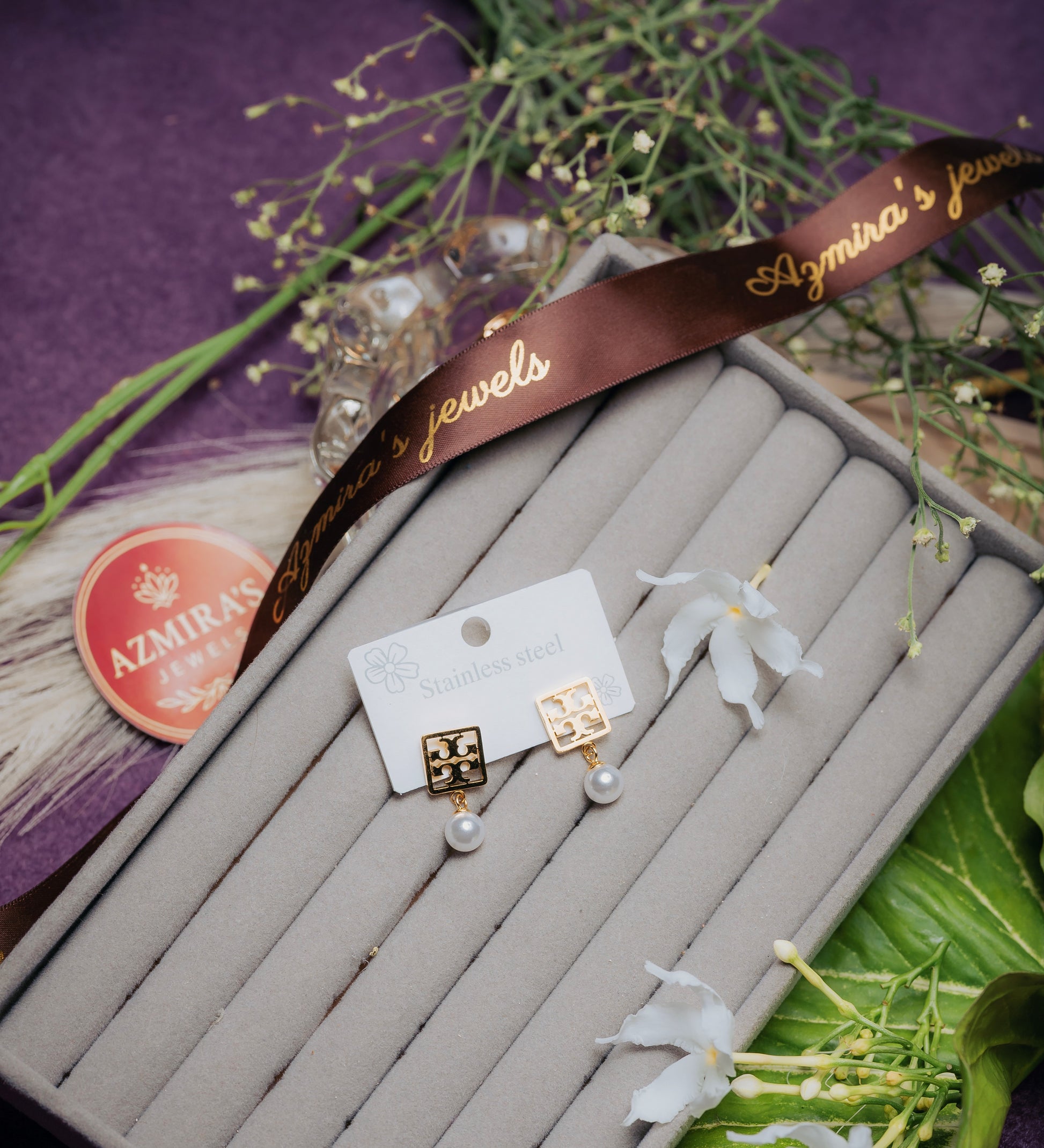 Bring a touch of designer elegance to your jewelry collection with these Tory Burch–inspired Gold Square Stud Earrings with Pearl Drop from Azmira’s Jewels. Crafted from premium stainless steel for lasting shine and durability, the gold-tone square stud features an intricate cut-out pattern reminiscent of timeless luxury styles, while a lustrous pearl drop adds a classic, feminine touch.