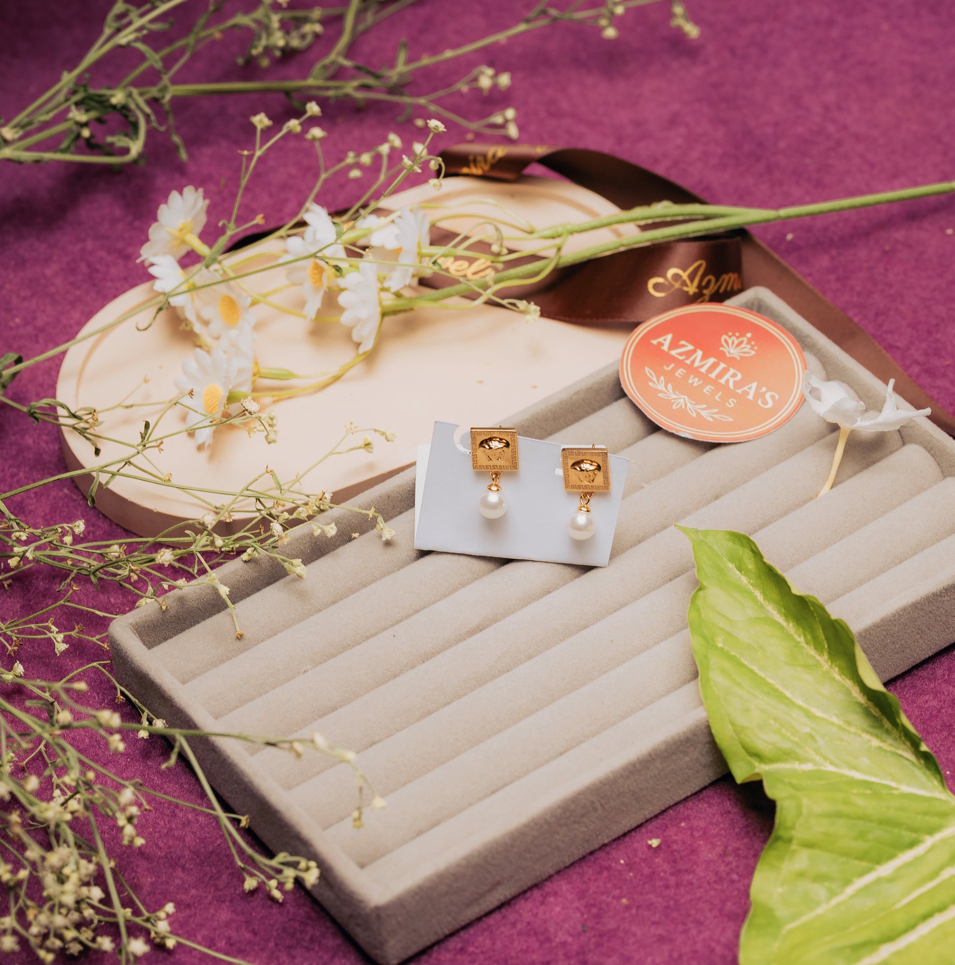 Channel timeless Parisian elegance with these Hermès-inspired Gold Stud Earrings with Pearl Drop from Azmira’s Jewels. Featuring a polished gold-tone rectangular stud with signature-style cut-out detailing, these earrings are finished with a delicate pearl drop for an effortlessly chic look.